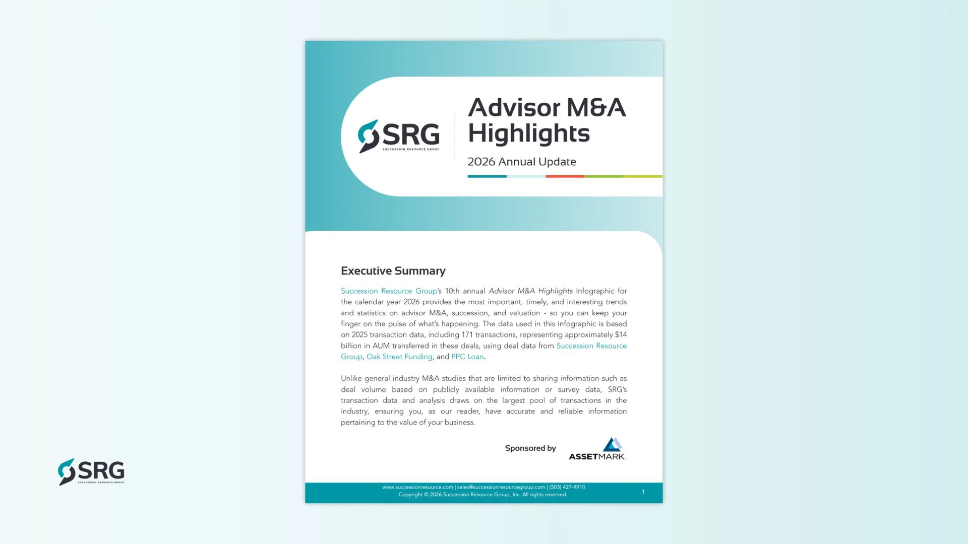 Succession Resource Group (SRG) is a consulting firm helping RIAs and advisors value, improve, protect, grow, transition and exit their businesses. Backed by the industry’s most experienced team and proprietary data, SRG’s advisor-centric approach provides clarity and confidence in every stage of the business lifecycle. SRG puts advisors’ success first.