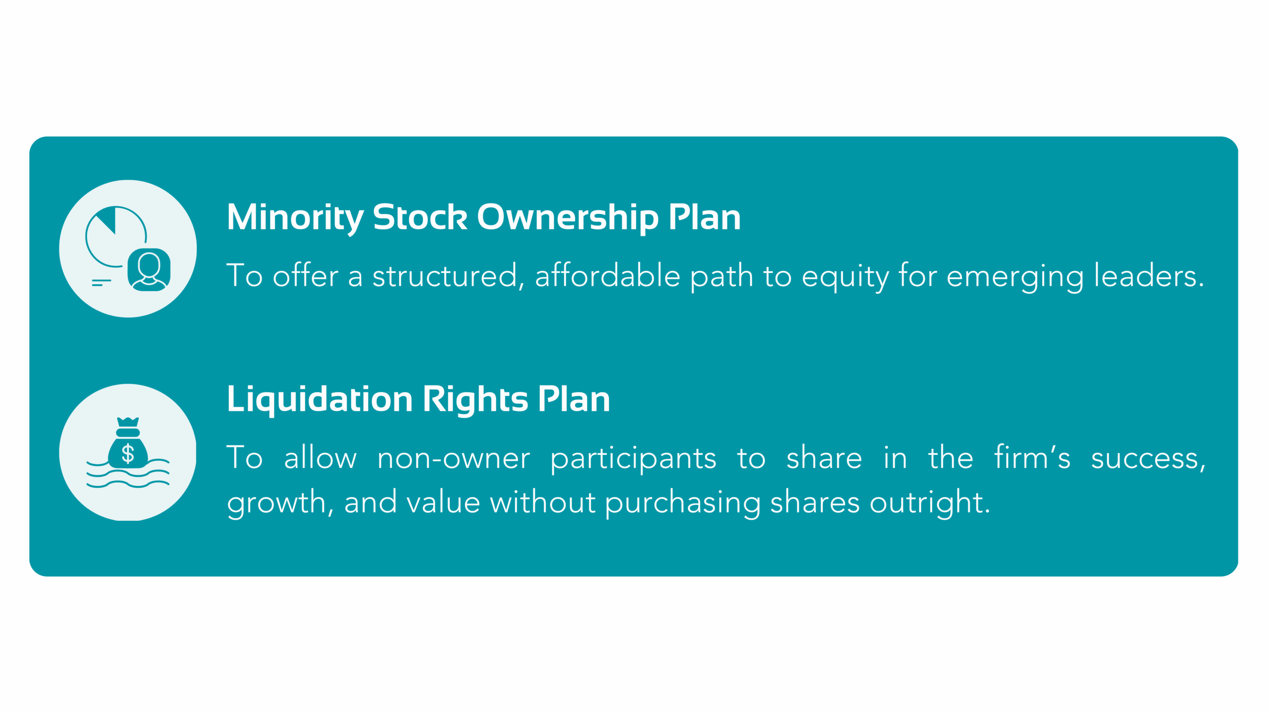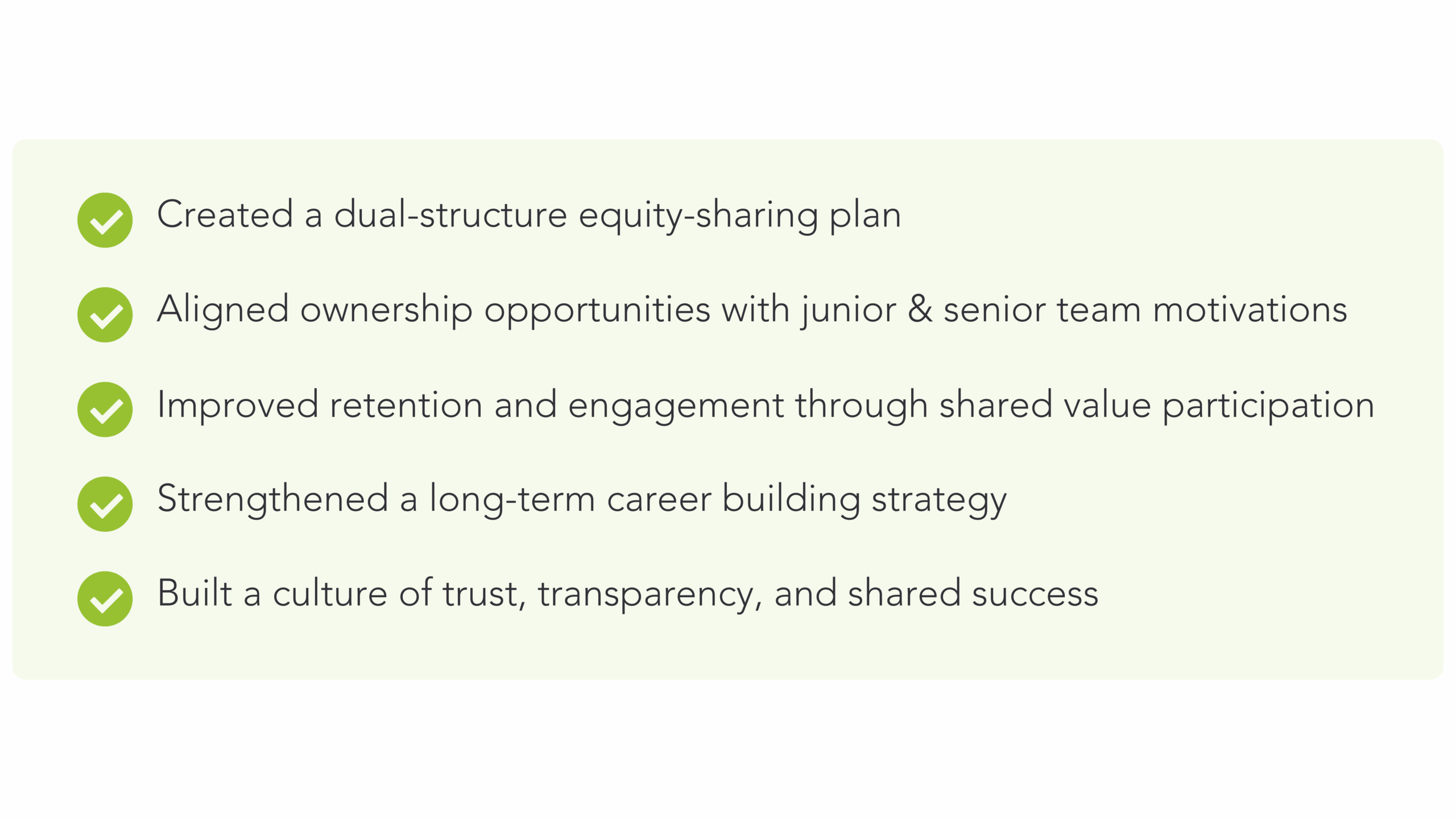 Led by Julia Sexton, CVA®, Director of Strategic Organization Planning, SRG developed a personalized plan that aligned with the firm’s culture and goals. The resulting Equity Sharing Plan provided a balanced framework that: