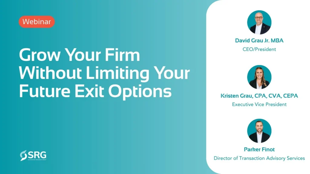 Watch the Replay Are Your Growth Decisions Expanding or Limiting Your Future Exit Options? Many advisors focus on growth without realizing the structural decisions they make today can shape their future exit options. In this on-demand webinar, Succession Resource Group explores how growth-stage RIAs and independent advisory firms can increase enterprise value while preserving strategic flexibility. Learn how firms position themselves to remain scalable, transferable, and attractive in today’s M&A market, while keeping the door open for internal succession, a future sale or merger, capital investment, or long-term independence by choice rather than default. Download the Presentation Deck Here Download Speakers Host David Grau Jr. MBA CEO/President Paper-plane Linkedin-in Host Kristen Grau, CPA, CVA, CEPA Executive Vice President Paper-plane Linkedin-in Host Parker Finot Director of Transaction Advisory Services Paper-plane Linkedin-in